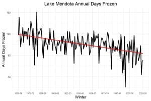 Figure 1. Total days that Madison’s Lake Mendota is frozen over each winter since 1855. The red line indicates a best-fit trend line, showing a clear decline in the number of iced-over days over time. Data source: Wisconsin State Climatology Office.
