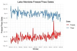 One way of chronicling climate change in cooler regions like Wisconsin is to look at trends in ice on waterbodies. Tracking things like freezing and thawing dates or total duration of ice cover provides insight into the changing climate. Importantly, records of waterbody ice coverage can extend further back than reliable records of air temperature, providing a longer record to examine.